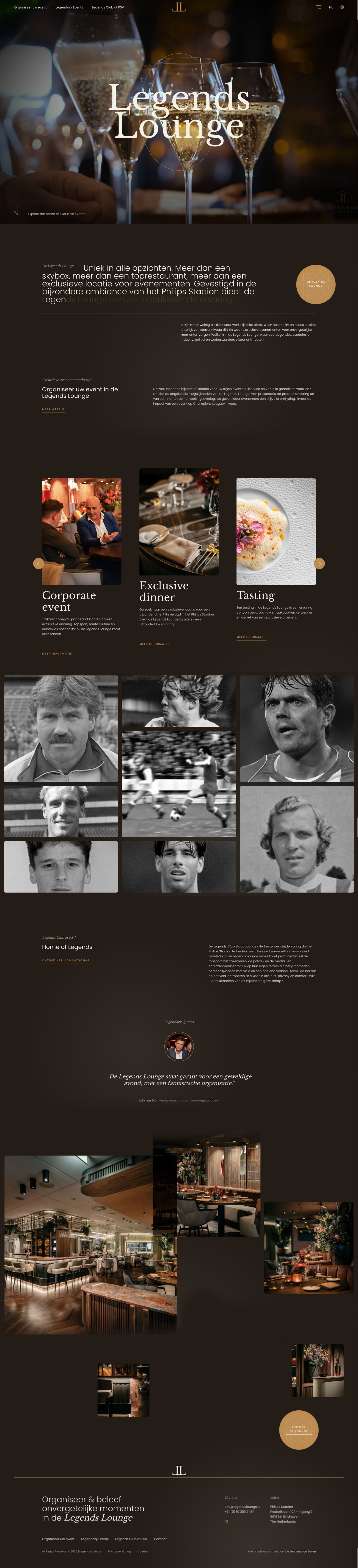 Legends Lounge redefines hospitality at the highest level. Nestled in PSV’s iconic Philips Stadion, this space blends the energy of elite sport with the elegance of top-tier gastronomy. DJVB translated this unique fusion into a digital identity that feels just as refined, sharp, spacious, and fully tailored to a premium experience.